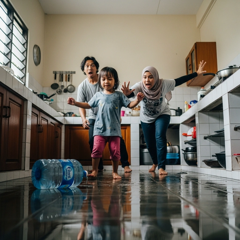 Botol besar yang tumpah boleh rosakkan lantai kayu atau masuk celah kabinet jadi sarang kulat.
